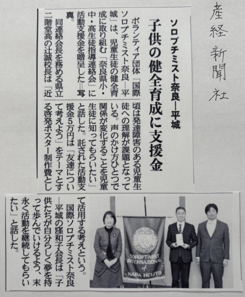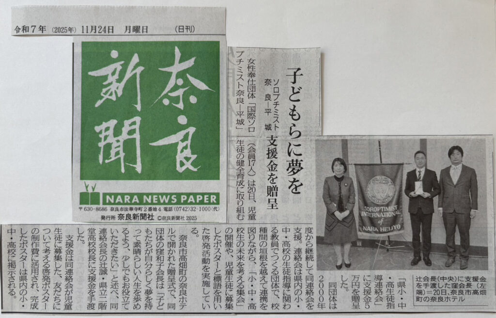 国際ソロプチミスト奈良-平城は、2000 年から”校種を超えて連携し、保護者や関係機関と