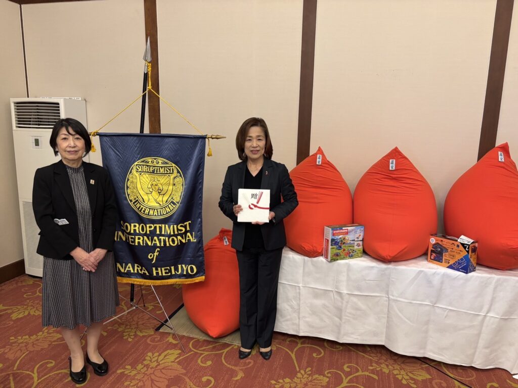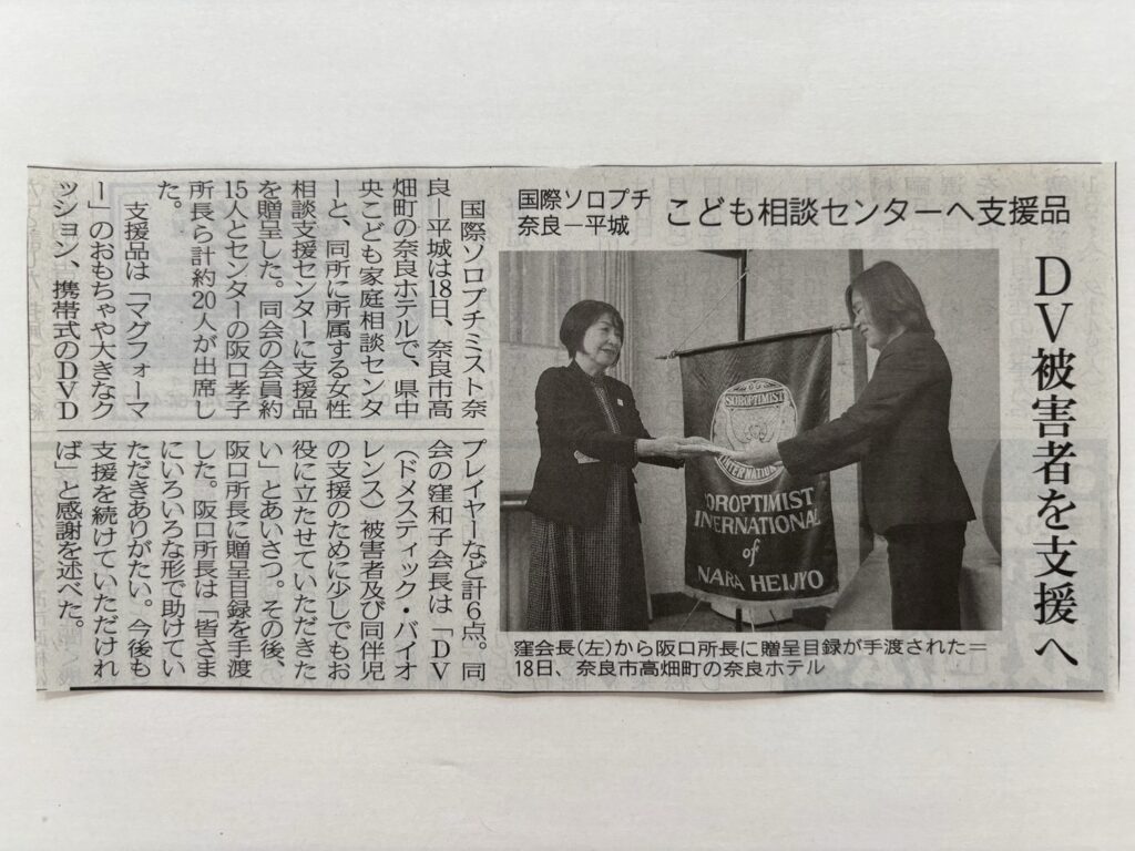 配偶者からの暴力被害者および同伴児(以下『DV被害者』という)の自立の支援に寄与するため2003年『国際ソロプチミスト奈良-平城慈善募金』を設置致しました。DV被害者の自立の為に募金による支援をしております。本年度は、くつろいでいただく為のクッション、同伴児童のストレスを図り楽しい時間が過ごせる様にポータブルDVDプレーヤーや、子供の遊びを通じてコミュニケーション能力を引き出し育むため等検討致しまして支援用品を寄贈させて頂きました。